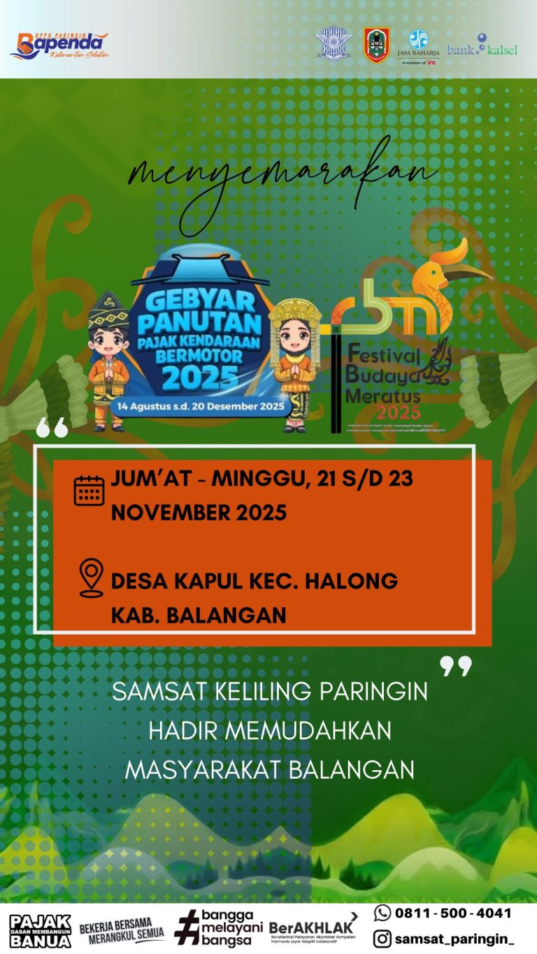 Paringin, 21 November 2025 – Dalam rangka mendekatkan layanan kepada masyarakat serta mendukung agenda daerah, Unit Pelaksana Pelayanan Pendapatan Daerah (UPPD) Paringin melaksanakan layanan Samsat Keliling pada kegiatan Festival Budaya Meratus yang diselenggarakan di Desa Kapul. Kehadiran layanan ini menjadi…