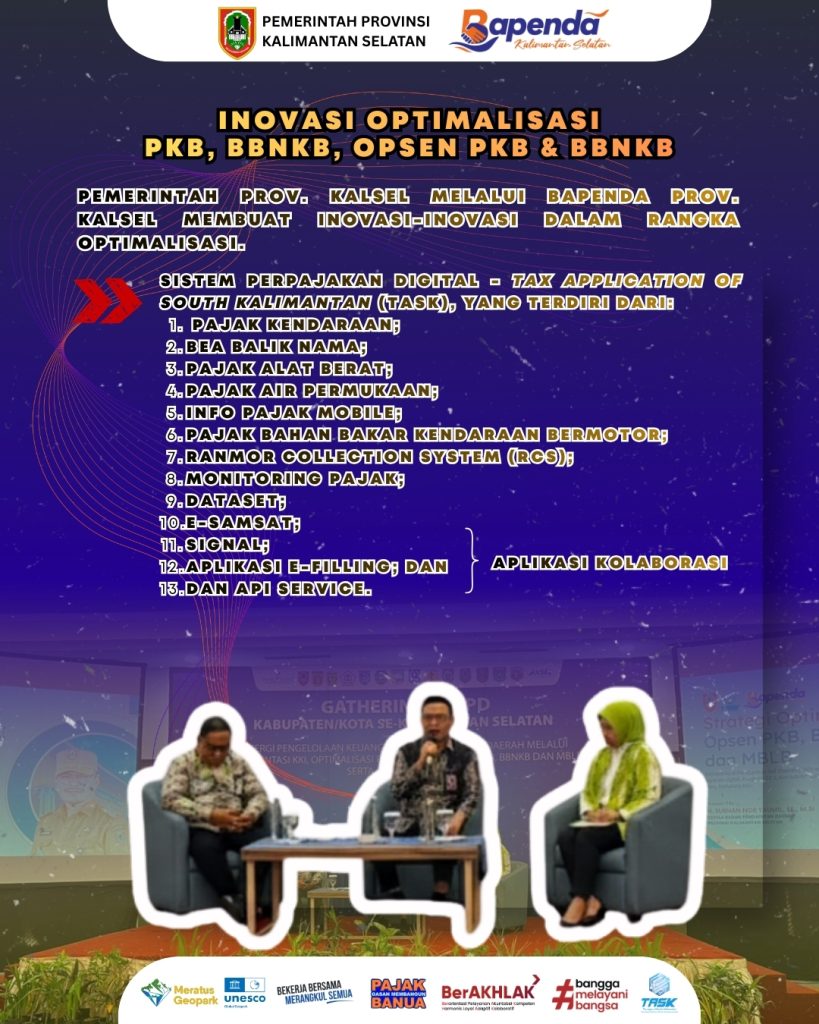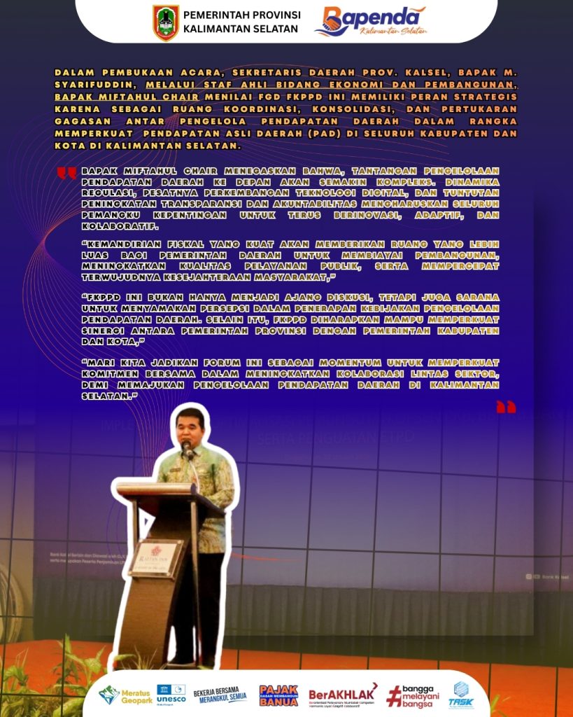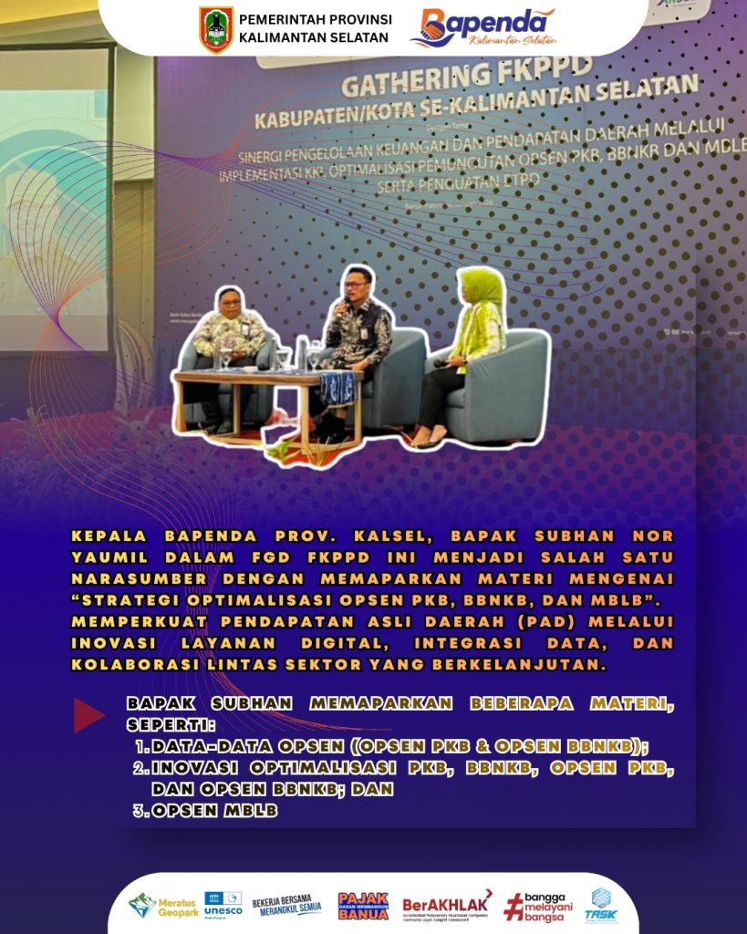 Kepala Bapenda Prov. Kalsel, Bapak Subhan Nor Yaumil dalam FGD FKPPD ini menjadi salah satu narasumber dengan memaparkan materi mengenai “Strategi Optimalisasi Opsen PKB, BBNKB, dan MBLB” Memperkuat Pendapatan Asli Daerah (PAD) melalui inovasi layanan digital, integrasi data, dan kolaborasi lintas sektor yang berkelanjutan.