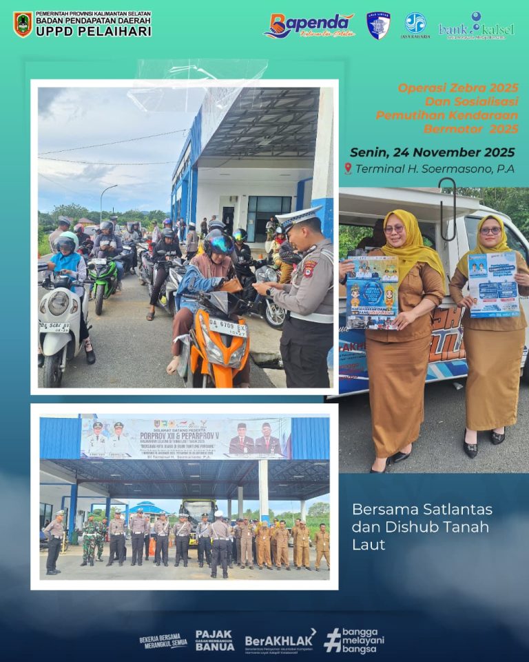 Pelaihari – Senin, 24 November 2025 Unit Pelayanan Pendapatan Daerah (UPPD) Samsat Pelaihari ikut melaksanakan Kegiatan Operasi Zebra dan Sosialisasi Pemutihan Pajak 2025 bersama Satlantas Polres Tanah Laut dan Dinas Perhubungan Tanah Laut di Teminal H. Soermasono, P.A. Kabupaten Tanah…