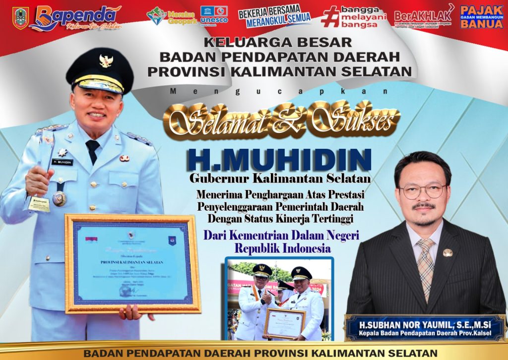 Badan Pendapatan Daerah Provinsi Kalimantan Selatan menyampaikan ucapan selamat dan sukses kepada Gubernur Kalimantan Selatan, H. Muhidin, atas prestasi gemilang yang diraih di tingkat nasional. Penghargaan tersebut diberikan oleh Kementerian Dalam Negeri Republik Indonesia atas capaian dalam penyelenggaraan pemerintahan daerah dengan status kinerja tertinggi. Penyerahan penghargaan berlangsung di Jakarta pada Senin, 27 April 2026. Capaian ini menjadi bukti nyata keberhasilan Pemerintah Provinsi Kalimantan Selatan dalam meningkatkan kualitas tata kelola pemerintahan, pelayanan publik, serta kinerja birokrasi yang efektif dan akuntabel. Keluarga besar Bapenda Kalsel berharap prestasi ini dapat terus dipertahankan dan menjadi motivasi untuk meningkatkan kinerja serta pelayanan kepada masyarakat di masa yang akan datang.