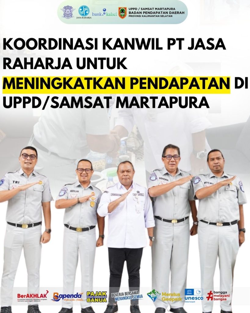 UPPD/Samsat Martapura bersama Kanwil PT Jasa Raharja menggelar kegiatan koordinasi dalam rangka optimalisasi pendapatan dan peningkatan kualitas pelayanan kepada masyarakat. Pertemuan ini membahas sinergi strategis antara Samsat dan Jasa Raharja, khususnya terkait upaya intensifikasi pendapatan melalui peningkatan kepatuhan wajib pajak, penyempurnaan alur layanan, serta edukasi keselamatan dan perlindungan bagi pengguna kendaraan bermotor.