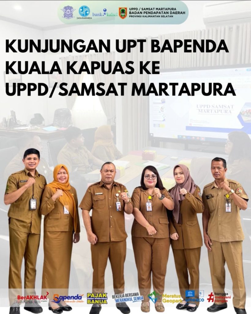 UPPD/Samsat Martapura menerima kujungan dari Unit Pelaksana Teknis Badan Pendapatan Daerah (UPT Bapenda) Kuala Kapuas dalam rangka koordinasi dan konsultasi teknis terkait berbagai aspek pengelolaan pendapatan daerah. Kegiatan ini bertjuan untuk memperdalam pemahaman dan berbagi pengalaman mengenai mekanisme penganggaran opsen PKB dan BBNKB, serta pembahasan mengenai pengelolaan PAP dan PAB. Selain itu, turut dibahas juga strategi penanganan tunggakan pajak kendaraan dinas (plat merah) yang masih menjadi tantangan dalam optimalisasi penerimaan daerah. Kepala UPPD/Samsat Martapura beserta jajaran menyambut baik kunjungan ini sebagai bentuk sinergi antar daerah dalam meningkatkan profesionalisme, trasparasi, dan efektivitas pengelolaan pendapatan daerah. Melalui kegiatan koordinasi ini diharapkan terjalin hubungan kerja sama yang lebih erat antara UPT Bapenda Kuala Kapuas dan UPPD/Samsat Martapura.