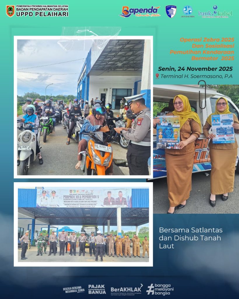 Pelaihari – Senin, 24 November 2025 Unit Pelayanan Pendapatan Daerah (UPPD) Samsat Pelaihari ikut melaksanakan Kegiatan Operasi Zebra dan Sosialisasi Pemutihan Pajak 2025 bersama Satlantas Polres Tanah Laut dan Dinas Perhubungan Tanah Laut di Teminal H. Soermasono, P.A. Kabupaten Tanah Laut