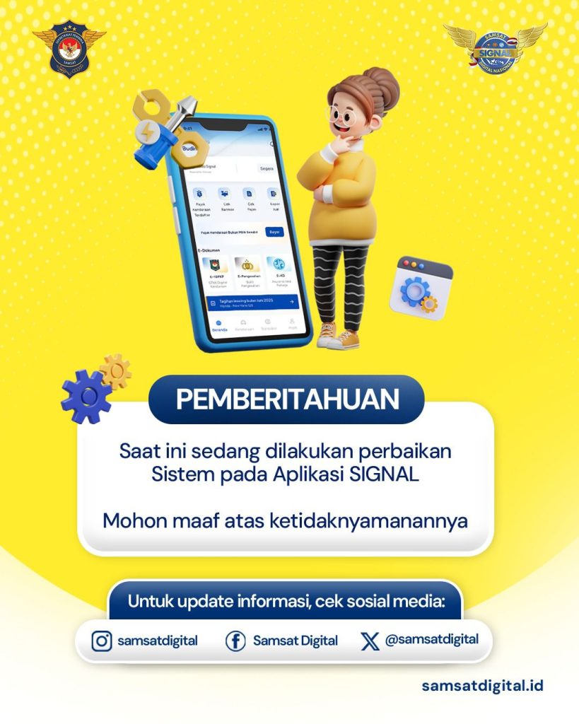 Sehubungan dengan proses maintenance tersebut, layanan pembayaran pajak kendaraan bermotor dan layanan lainnya melalui Aplikasi SIGNAL untuk sementara waktu belum dapat digunakan hingga adanya pemberitahuan lebih lanjut mengenai normalisasi sistem.