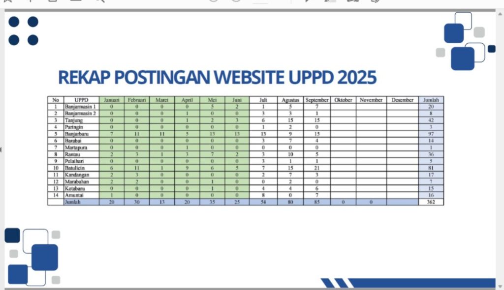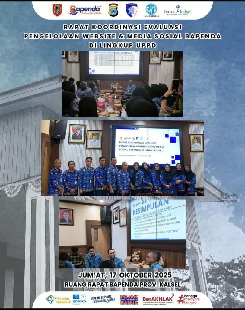 Jumat, 17 Oktober 2025, Badan Pendapatan Daerah (Bapenda) Kalimantan Selatan menyelenggarakan rapat koordinasi evaluasi pengelolaan website dan media sosial di lingkup Unit Pelayanan Pendapatan Daerah (UPPD). Rapat ini berlangsung di ruang rapat Bapenda Kalsel dan dihadiri oleh perwakilan dari masing-masing UPPD.