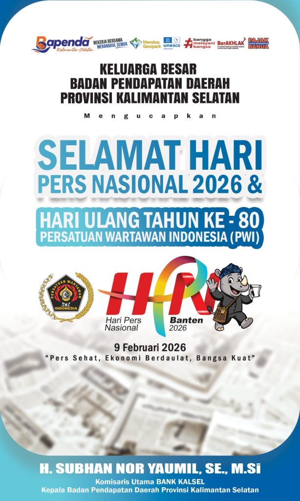 Keluarga Besar Badan Pendapatan Daerah Provinsi Kalimantan Selatan mengucapkan Selamat Hari Pers Nasional (HPN) 2026 sekaligus Hari Ulang Tahun ke-80 Persatuan Wartawan Indonesia (PWI) yang diperingati pada 9 Februari 2026.