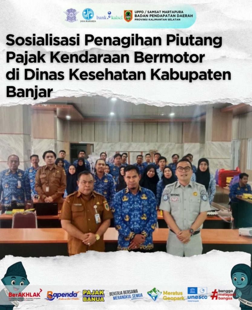 UPPD/Samsat Martapura melaksanakan kegiatan Sosialisasi Penagihan Piutang Pajak Kendaraan Bermotor ke Dinas Kesehatan Kabupaten Banjar sebagai upaya peningkatan kepatuhan serta optimalisasi penerimaan daerah. Kegiatan ini bertujuan untuk memberikan pemahaman yang lebih komprehensif terkait kewajiban pembayaran pajak kendaraan operasional (plat merah) yang masih memiliki tunggakan.
