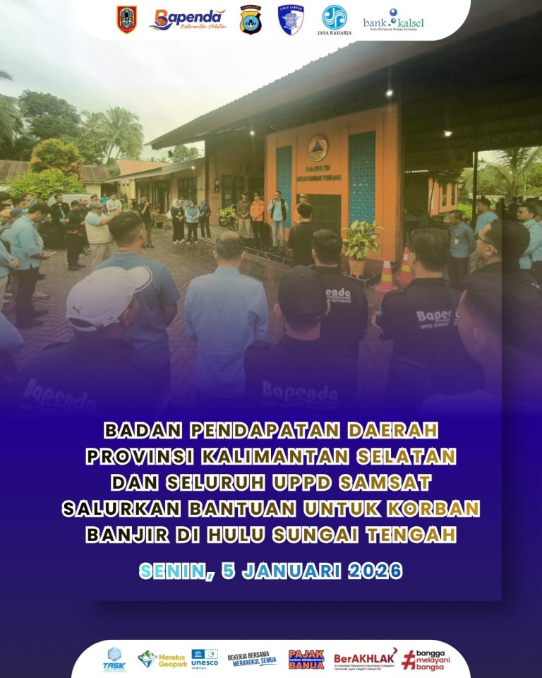 Hulu Sungai Tengah (Senin/5/2026)– Badan Pendapatan Daerah Provinsi Kalimantan Selatan bersama seluruh UPPD Samsat se-Kalimantan Selatan menyalurkan bantuan kemanusiaan kepada para korban banjir di Kabupaten Hulu Sungai Tengah. Kegiatan ini dilaksanakan atas instruksi dan arahan Bapak Gubernur Kalimantan Selatan…