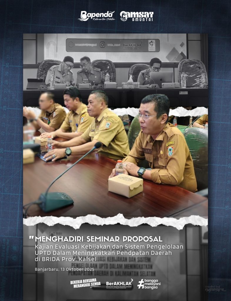 Banjarbaru 13 Oktober 2025 — Kepala UPPD Amuntai, Bapak Maqdis Pilatia telah menghadiri seminar proposal penelitian yang mengangkat tema “Evaluasi Kebijakan dan Sistem Pengelolaan UPTD dalam Meningkatkan Pendapatan Daerah” yang digelar oleh BRIDA Provinsi Kalimantan Selatan.