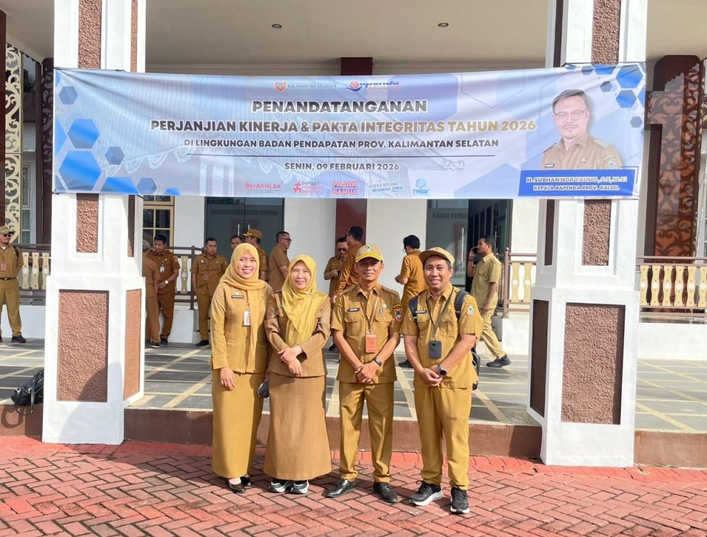 Banjarbaru — Kepala UPPD Banjarmasin II beserta Kepala Sub Bagian Tata Usaha, Kepala Seksi PKB & BBN-KB, dan Kepala Seksi Pendapatan Lainnya menghadiri Apel Bersama dan Penandatanganan Perjanjian Kinerja (PK) Tahun 2026 yang dirangkaikan dengan Rapat Koordinasi serta Pisah Sambut Pejabat di lingkungan Badan Pendapatan Daerah Provinsi Kalimantan Selatan. Kegiatan tersebut dilaksanakan pada hari Senin, 9 Februari 2026, bertempat di Kantor Bapenda Provinsi Kalimantan Selatan dan diikuti oleh seluruh jajaran pegawai Bapenda serta perwakilan UPPD se-Kalimantan Selatan.